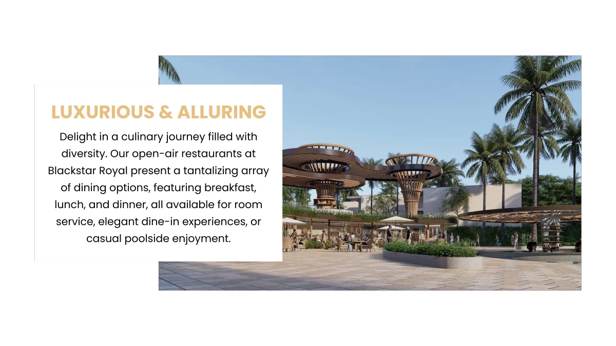 Indulge in the artistry of Blackstar Royal – an iconic destination where every element is curated to elevate your coastal experience. Whether you're a professional seeking a respite from the demands of corporate life or a connoisseur of celebratory moments, our resort invites you to savor a distinguished blend of coastal sophistication. Embrace the allure of Blackstar Royal – where pure joy meets endless happiness.